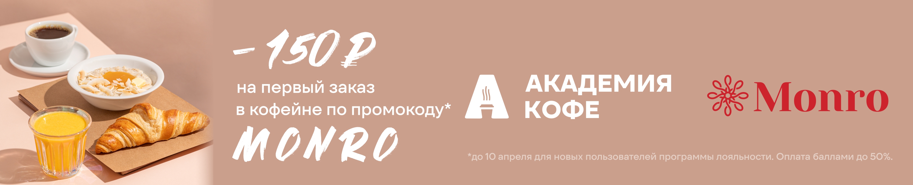 Условия акции: с 26.03.2026 г. по 10.04.2026 г. по промокоду "MONRO" в филиалах кофеен Академия Кофе предоставляется скидка в размере 150 рублей на первый заказ при регистрации в программе лояльности. Скидка предоставляется только новым пользователям программы лояльности.