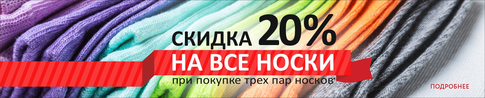 Условия акции: при покупке 3-х пар носков - покупателю предоставляется скидка 20% на все носки в чеке (женские, мужские, детские).