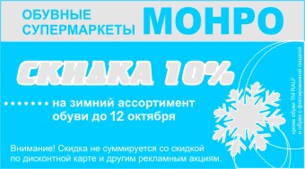 В период с 5 по 12 октября всем предъявителям купона «10% скидка на зимний ассортимент», предоставляется скидка 10%.