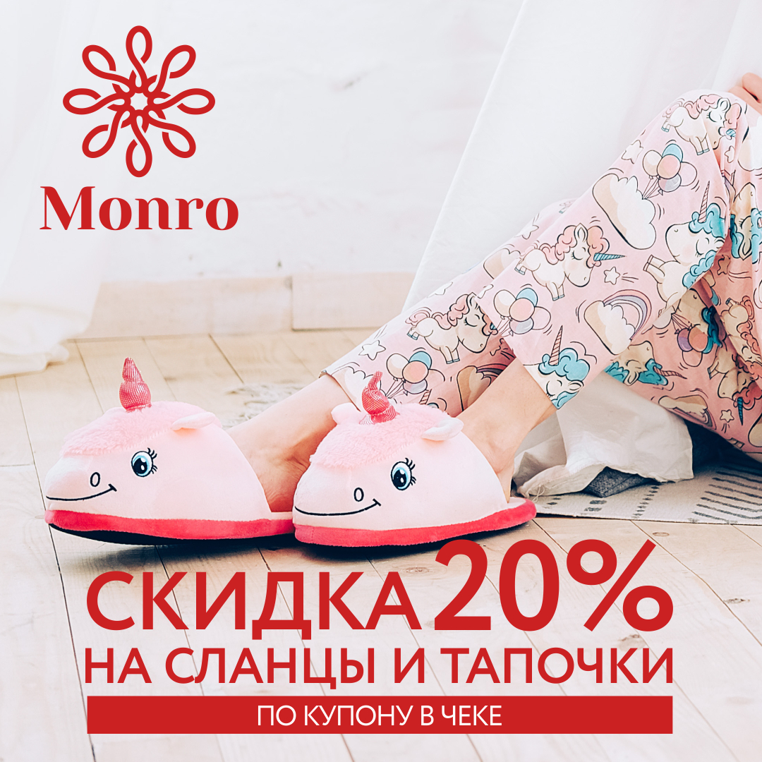 А чтобы была возможность запасти побольше удобной обуви для всех, кому хочется её подарить, МОНРО запускает уютную акцию: при совершении любой покупки, получайте на чеке купон, позволяющий использовать СКИДКУ 20% на весь ассортимент сланцев и тапочек при следующем приобретении. Спешите, ведь акция продлится только до 31-го декабря!