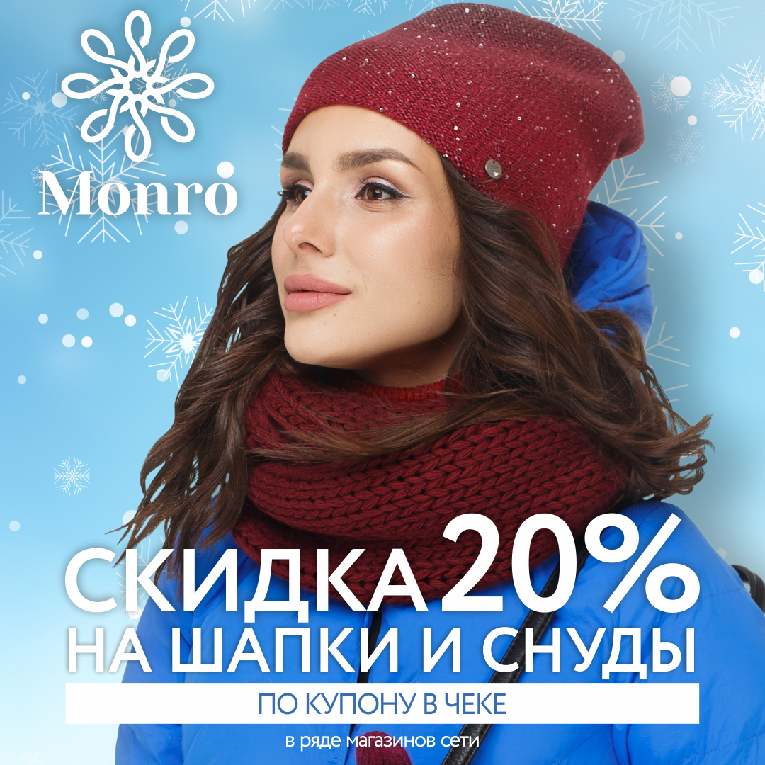 Условия акции: при покупке любых товаров в магазинах сети МОНРО покупателю предоставляется купон, по которому можно получить скидку 20% на ассортимент шапок и снудов при совершении следующей покупки.