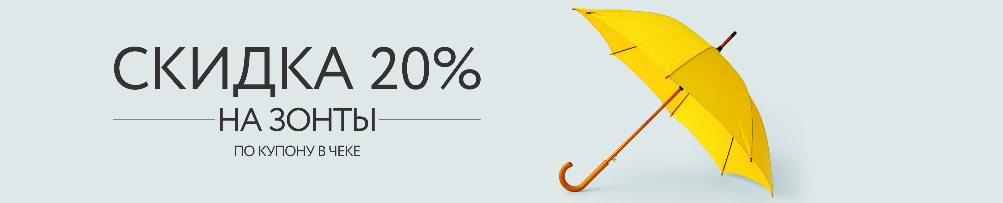 Условия акции:при совершении покупки любого товара в магазинах бренда, покупатель получает купон, напечатанный на чеке, при предъявлении которого в рамках следующей покупки предоставляется скидка 20% на ассортимент женских, мужских и детских зонтов с одинарными белыми ценниками.